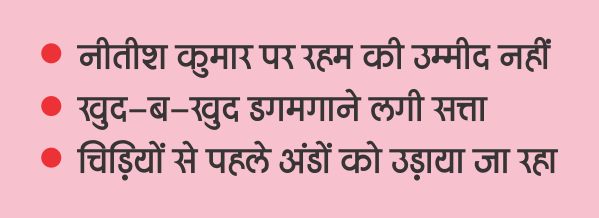 बिहार में तख्तापलट आसान नहीं दिखता है, तो यह असंभव भी नहीं है, क्योंकि जंगल में शिकार करते समय जब शेर खुद जख्मी होता है, तब उसकी बादशाहत कायम नहीं रहती है. पिछली बार नीतीश कुमार एनडीए (NDA) छोड़कर महागठबंधन (Mahagathbandhan) में शामिल हुए थे तो उन्होंने यही कारण बताया था- ‘उनकी पार्टी को तोड़ने की साजिश चल रही थी.’ जैसे ही विपक्षी दलों के विधायकों को तोड़ने-जोड़ने की कार्ययोजना पर अमल शुरू होगा, मुख्यमंत्री की कुर्सी खुद-ब-खुद डगमगाने लगेगी, सियासत हिचकोले खाने लगेगी. हालांकि, भाजपा नहीं चाहेगी कि पश्चिम बंगाल (West Bengal) के चुनाव से पहले बिहार एनडीए में कोई खटास पैदा हो, लेकिन जब विधायकों के तोड़-जोड़ का खेल शुरू होगा, तो नहीं चाहते हुए भी उसे पांव बढ़ाना पड़ ही जा सकता है.