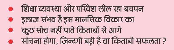 बच्चों के साथ संवाद की कमी भी एक बड़ी समस्या है. असल में आज की भाग-दौड़ भरी जिन्दगी में माता-पिता अपने बच्चों को पर्याप्त समय नहीं दे पाते हैं. कामकाजी परिवारों में यह समस्या कुछ ज्यादा है, जहां एकल परिवारों में पति और पत्नी दोनों काम कर रहे हैं. ऐसे परिवारों को लगता के बच्चों में अवसाद (Depression) सबसे ज्यादा घर कर रहा है. इन बच्चों में यह धारणा बैठ जाती है कि माता-पिता के पास उनके लिए समय नहीं है. ये बच्चे अपने मन की बात किससे कहें? मनोचिकित्सकों (Psychiatrists) का मानना है कि आजकल छोटे बच्चे भी अवसाद और चिंता का शिकार हो रहे हैं. इसकी दो बड़ी वजह हैं. एक तो यह कि बच्चों को लगता है कि दुनिया में उनका कोई नहीं है, उनकी चिंता किसी को नहीं है. दूसरी, उन पर पढ़ाई का बोझ सबसे ज्यादा है. बेहतर प्रदर्शन की दौड़ में पिछड़ने का डर उनके मन में इस कदर बैठा दिया जाता है कि वे किताबों से आगे कुछ सोच ही नहीं पाते. राष्ट्रीय अपराध रिकार्ड ब्यूरो (NCRB) की वर्ष 2022 की रिपोर्ट के मुताबिक, 2022 में देश में 13 हजार 044 बच्चों ने आत्महत्या की. इन मामलों में 2 हजार 248 विद्यार्थियों ने परीक्षा में अनुत्तीर्ण होने पर यह कदम उठाया. वहीं एनसीआरबी के वर्ष 2001 के आंकड़ो के मुताबिक देश भर में उस साल 05 हजार 425 बच्चों ने आत्महत्या की थी. ये आंकड़े बताते हैं कि विद्यार्थियों की आत्महत्या की घटनाएं कितनी तेजी से बढ़ रही हैं. आईसीएमआर का सर्वेक्षण बताता कि देश में बारह से तेरह प्रतिशत विद्यार्थी मनोवैज्ञानिक, भावनात्मक और व्यवहार संबंधी समस्याओं से जूझ रहे हैं. ‘द लांसेट’ पत्रिका का एक अध्ययन बताता है कि दुनिया का हर बारह में से एक बच्चा कभी न कभी आत्महत्या के विचार अपने मन में अवश्य लाता है.